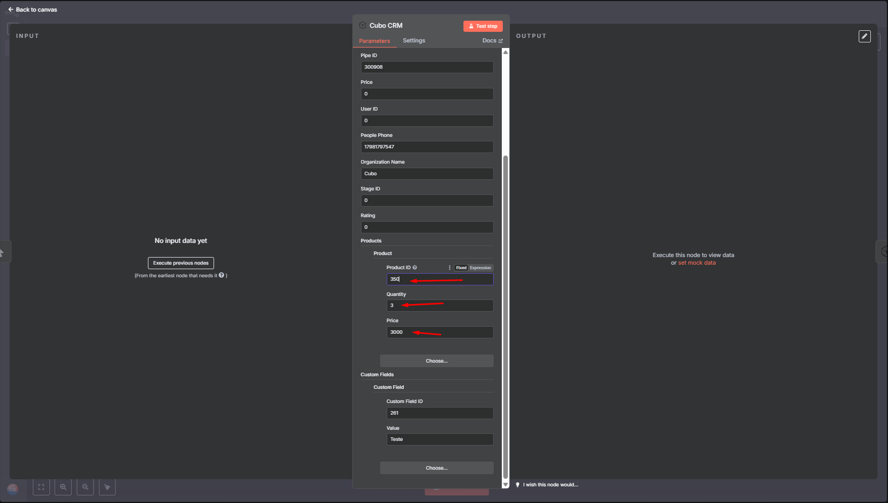 #### Preenchendo o **ID do produto** obtido do Cubo CRM e a **quantidade do produto** de acordo com a necessidade.