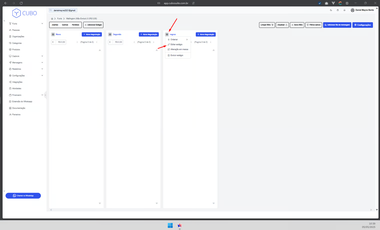 No funil escolhido, clique no icone de engrenagem e clique em editar estágio.