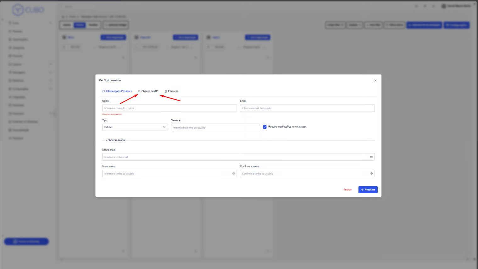 * No Cubo CRM, acesse o menu na seção de configurações, acesse usuários