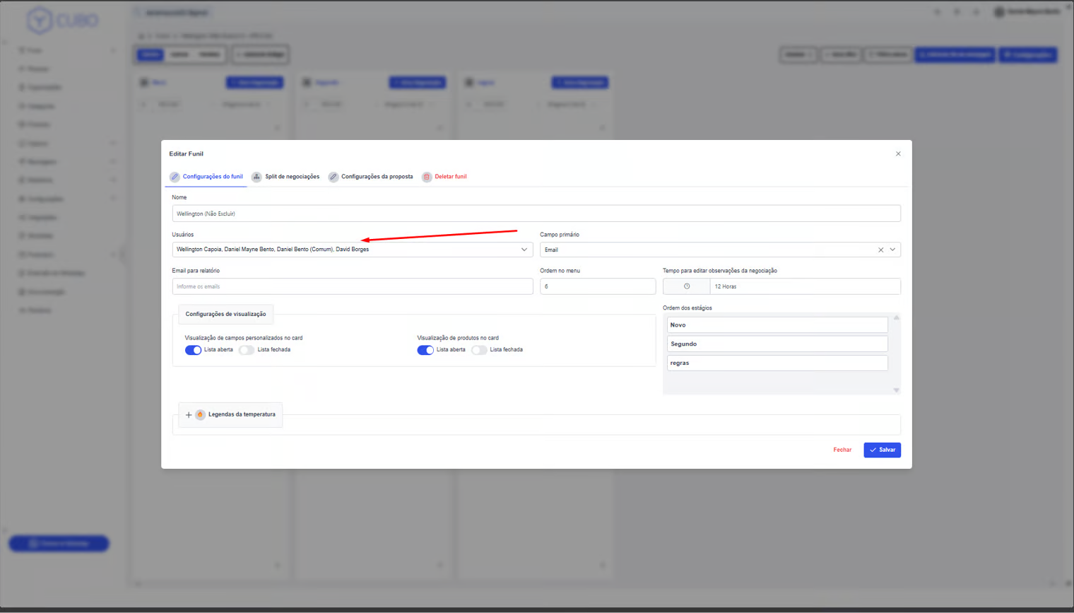 * Confira a lista de usuários permitidos para o funil em Configurações de funil.