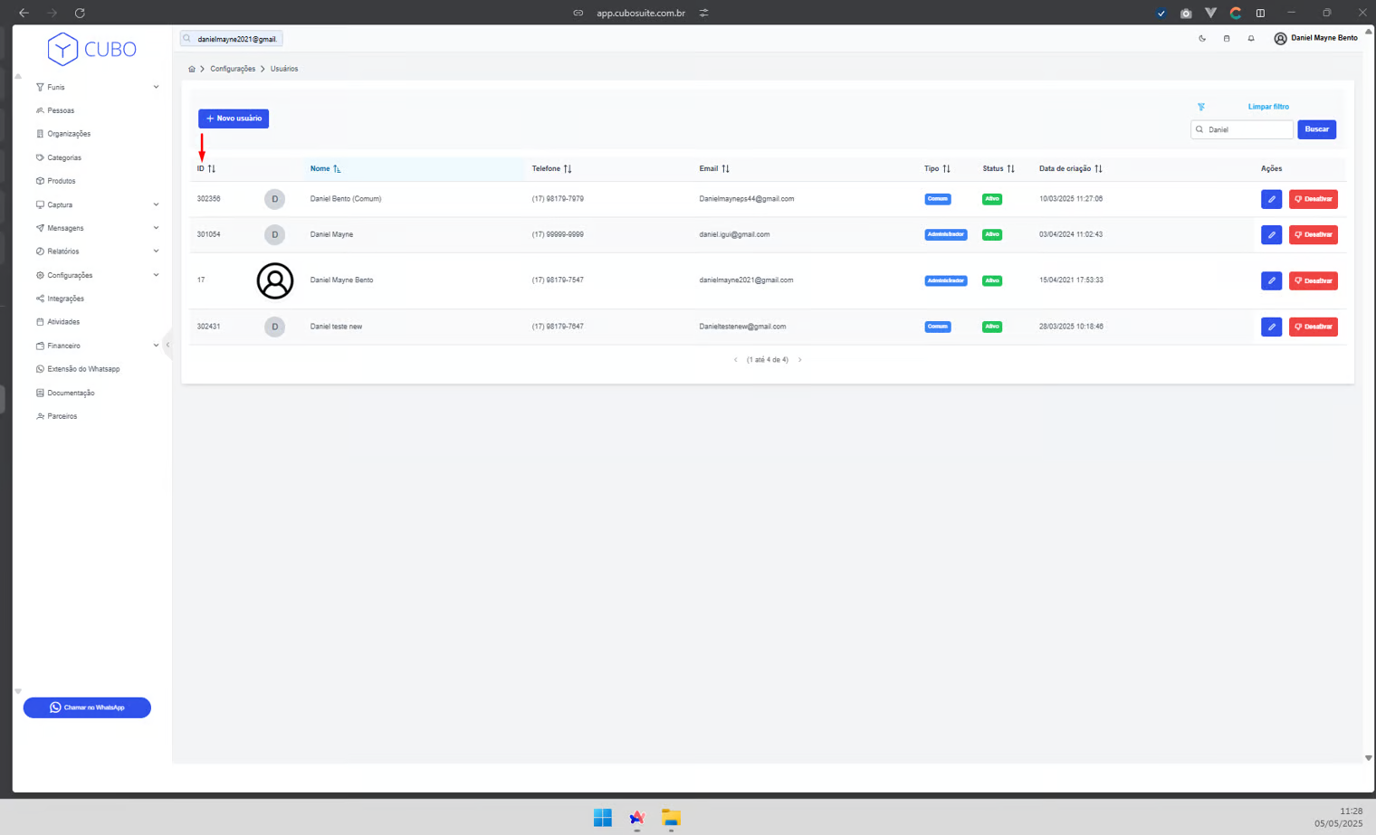 * Localize o usuário desejado e verifique seu ID, que estará na coluna ID