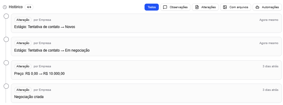 O **Histórico da Negociação** é o registro completo de todas as ações realizadas desde a criação da negociação até o momento atual.