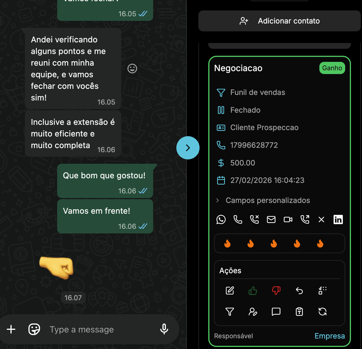 Apresentamos a 8ª maravilha do mundo em forma de extensão para o WhatsApp Web. Com apenas um clique, instale a extensão e gerencie suas oportunidades diretamente da janela do WhatsApp. Chega de esquecer de dar Ganho né?